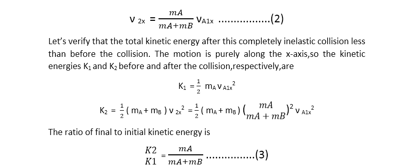 Suppose, for example, that a body with mass mA and initial x-component of velocity ν A1x collides inelastically with a body with mass mB that is initially at rest (ν B1x = 0). From Eq.(1) the common x-component of velocity ν 2x of both bodies after the collision is: