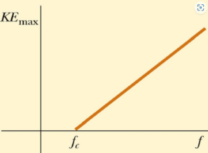 If a graph is plotted between the stopping potential V° and the frequency ‘u’ of the incident photon, we get a straight line as shown in the above figure. The line cuts the frequency axis at a point V°, where stopping potential is zero. The frequency V° is called cut off frequency, or threshold frequency.